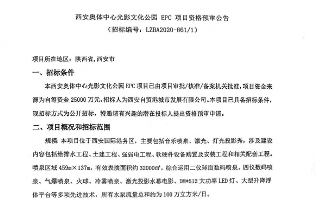 8月份,最新的招标公告显示,西安奥体中心将再投资2.5亿建造光影文化园,项目位于西安国际港务区,主要包括音乐喷泉、激光、灯光投影秀,全部采用大功率LED灯、大型升降浮体平台等先进技术,项目建成后将成为世界最大体量的灯光水秀,此外西咸地区已有“世博会大型灯光喷泉”、“咸阳双照水库大型灯光喷泉”“秦文明广场大型灯光喷泉”等诸多灯光喷泉,此次2.5亿巨额投资光影文化园之后,陕西或将成为亮化工程最多的省份。