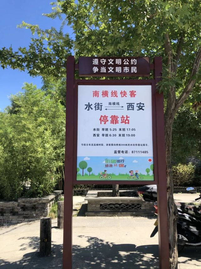 在西安水司汽车站乘坐西安至周至的旅游班车,每25分钟/班,全程仅需1.5小时,票价22元。直达周至水街景区游客服务中心北侧。 b