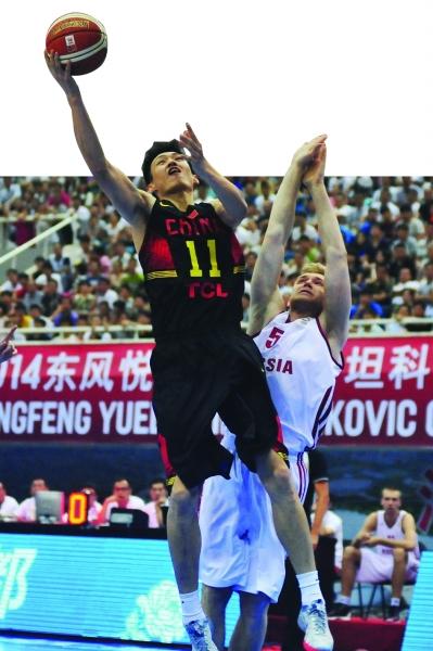 周鹏突破上篮。 昨天斯杯展开第二轮较量。凭借李晓旭最后6.3秒的三分球,中国男篮以62-60战胜俄罗斯男篮,夺得本届斯杯两连胜。不过,与第一场相比,男篮内线暴露出的问题,让人忧心忡忡。