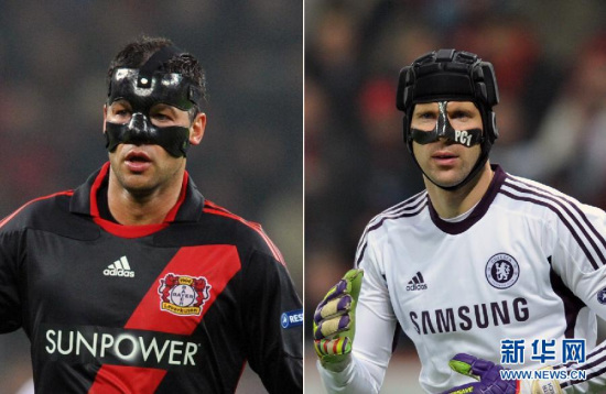 相比于其他蓝军兄弟,曾长久效力于切尔西的门神切赫的护具显然更“高级”一些,已经从单纯的面具升级为头盔。时至今日,不经意间,切赫化身“坦克兵”已有近十年的光景了。 在2006年的一场英超联赛中,切赫与雷丁球员史蒂芬-亨特相撞导致颅骨骨折,这几乎让他告别球场,切赫的家人认为对手用膝盖猛击切赫头部的这次犯规简直就是“谋杀”。为此医生在切赫颅骨中植入了两块金属片,以便舒缓骨折处对大脑的压迫。虽然手术后切赫恢复很快,并赶在赛季结束前重返赛场,但此后他却不得不戴上特制的护具头盔。 虽然如今头盔已经成为切赫的标志,但他本人似乎对这个物件并不十分推崇。去年夏天,切赫就曾表示,“如果我拿掉头盔,我会更加自信。不是说喜不喜欢的问题,戴着头盔比赛,你会你产生一些影响。” “当你的耳朵被东西覆盖住,你听声音时会不是那么轻松。但医生禁止我摘下头盔踢比赛,如果我摘下了头盔,我就得不到足够的保护。”看来要想在赛场上再看到不带头盔的捷克门神,还需要再等一段时间了。 “面具帮”中怎能少了坚毅的德国人的身影。在2011~2012赛季第11轮的德甲联赛中,当时效力于勒沃库森的中场悍将巴拉克在一次和对方球员罗森塔尔的冲撞中鼻梁骨折,不愿挂起免战牌的他不得不带上了一副特制的黑色面具。配合上勒沃库森的红黑剑条衫,带上面具的巴拉克简直就像一个杀手,令人不寒而栗。