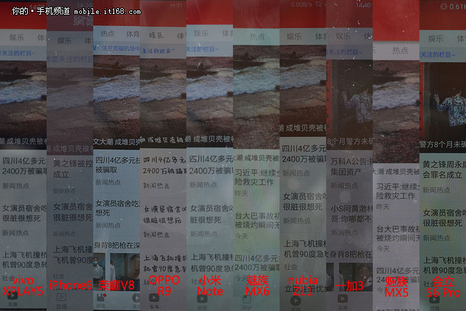 说到手机屏幕大家都会遇到这样的情况,在阳光猛烈的户外你看手机的屏幕很多时候由阳光太大了所以屏幕的内容看不清楚。随着手机屏幕技术的发展,已经有不少手机上宣传可以在阳光下能看清楚手机的屏幕,或美其名曰“阳光屏”,究竟现在的手机在阳光下像宣传那样可以在阳光下清晰显示呢?我们特意找来了2000元附近的10台手机进行了一个对比。 ▲热门手机阳光下屏幕对比 说到在阳光下看手机屏幕,要确保可以清晰看到主要由2个因素来决定,第一个,也是最重要的一个,就是手机的屏幕,手机屏幕的材质,是LCD还是AMOLED,是IPS还是其他的材质,in-Cell还是on-Cell,这些都是一个因素,另外屏幕的亮度也是很重要,在强光下你要有足够的亮度才能正常显示。第二个就是手机的光线传感器,这个传感器一般在手机的听筒附近,前置摄像头旁边,为什么说这个东西总要?因为在强光下这个传感器会检测光线的亮度再将数据给屏幕,调整手机屏幕的亮度。 如何测试: 我们将10台手机置于阳光下,下午2点钟的阳光,不仅亮度够,还非常热,之后再手机的亮度调到最亮,并且开启自动亮度功能,打开手机预先安装的网易新闻,使用单反拍摄手机的屏幕,相机参数统一调整到快门1/80s,光圈f6.3,ISO100,下面就来看一下拍摄的效果。 ▲测试过程 这次参与测试的手机包括vivo Xplay5、iPhone6、荣耀V8、OPPO R9 Plus、小米Note、魅族MX6、nubia Z11、一加3、魅族MX5和金立S6 Pro,我们只测试这些手机屏幕的阳光下的表现,其他参数大家可以忽略吧。 ▲左:vivo Xplay5 右:iPhone6