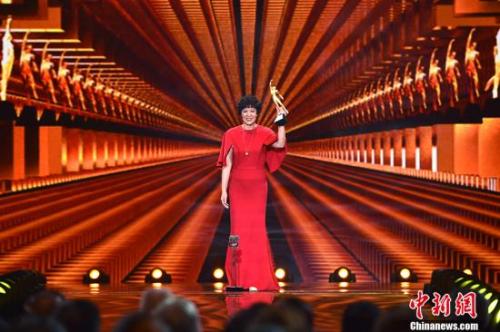 女排主教练郎平一袭红裙,获得最佳教练奖。 中新网记者 金硕 摄