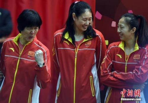 郎平教练(左)扮“鬼脸儿”逗趣。 中新社记者 张宇 摄