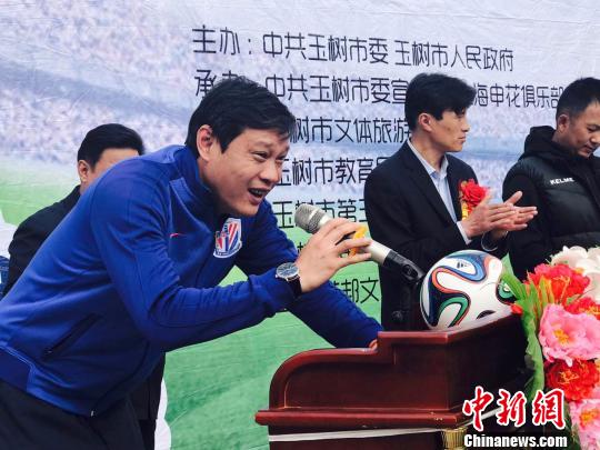 5月10日,玉树市青少年足球学校在该市第三完全小学授牌成立。图为授牌仪式现场亚洲足球先生范志毅致辞。 钟欣 摄