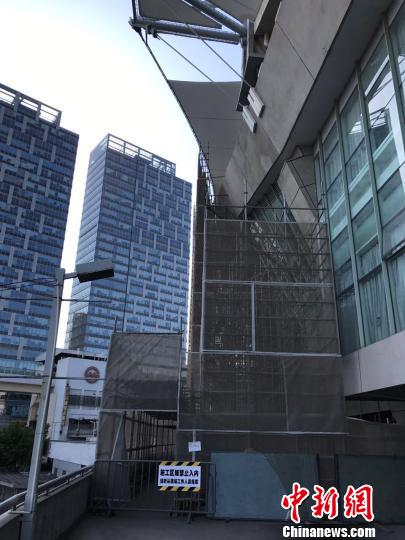 脚手架外包裹着防护网,修缮工作未全部完成。 王子涛 摄