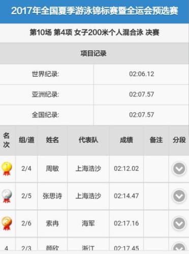 2017年全国夏季游泳锦标赛暨全运会预选赛26日在江西省赣州市章贡区落下帷幕。在最后一个比赛日中,上海浩沙代表队周敏以2分12秒02夺得女子200米个人混合泳冠军,山东浩沙代表队的杨浚瑄以2分11秒63夺得女子200米仰泳冠军。